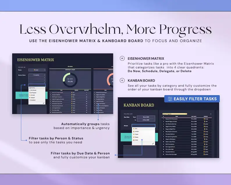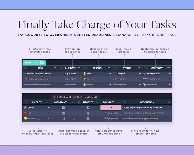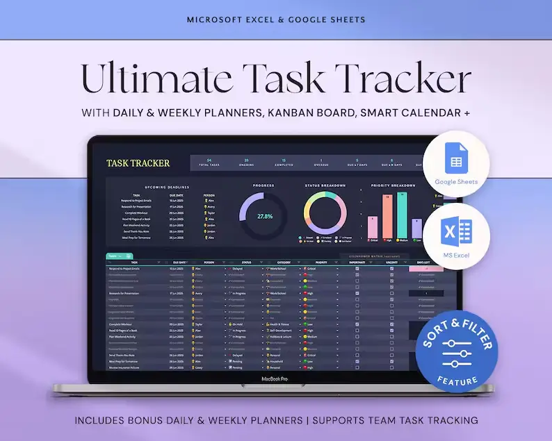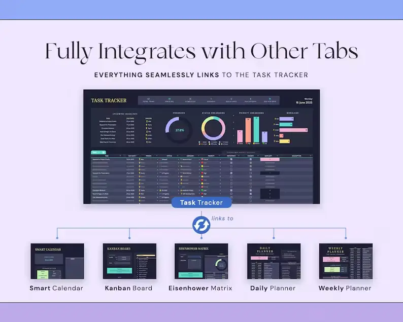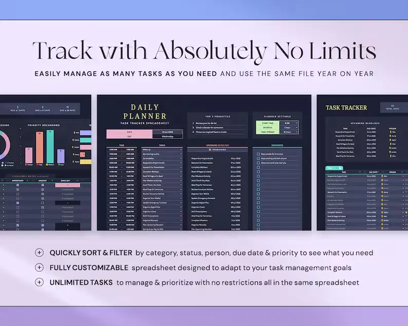 Keep everything in a single spreadsheet — tasks, priorities, deadlines, progress, calendars, weekly spreads, and more. No more switching between multiple apps!