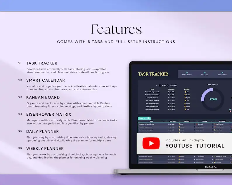 🗂️ 6 Organized Tabs: Task Tracker, Daily Planner, Weekly Planner & more