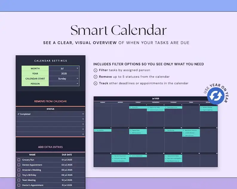Use this spreadsheet for multiple years without creating new files. Simply update dates and continue tracking — perfect for long-term organization.
