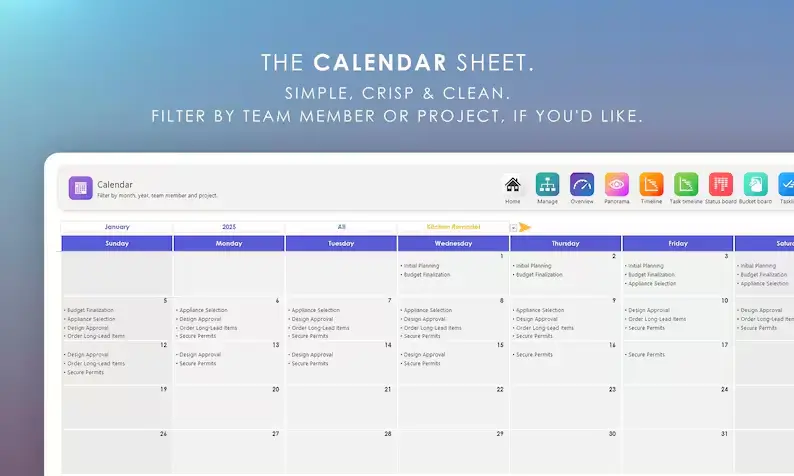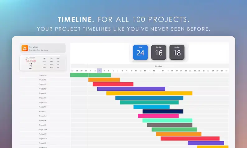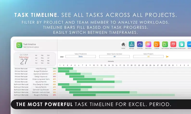 Crystal-clear daily task timelines that span two full years — with options to highlight weekends, hide completed tasks, and view dynamic task stats.