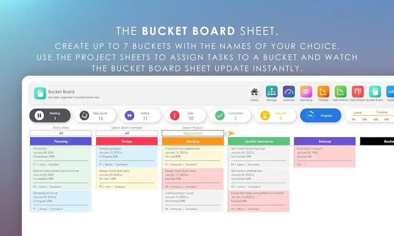 • Kanban views: Bucket Board + Status Board